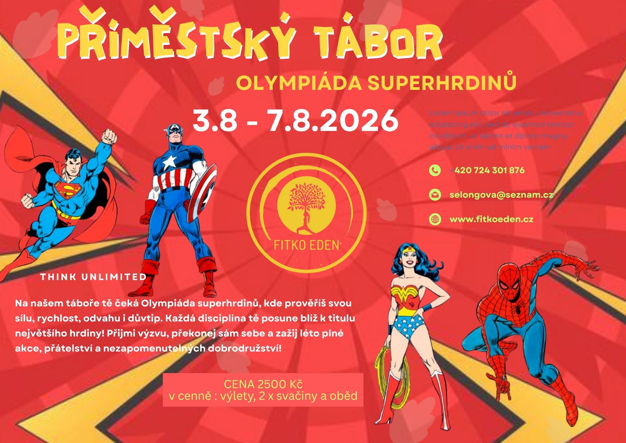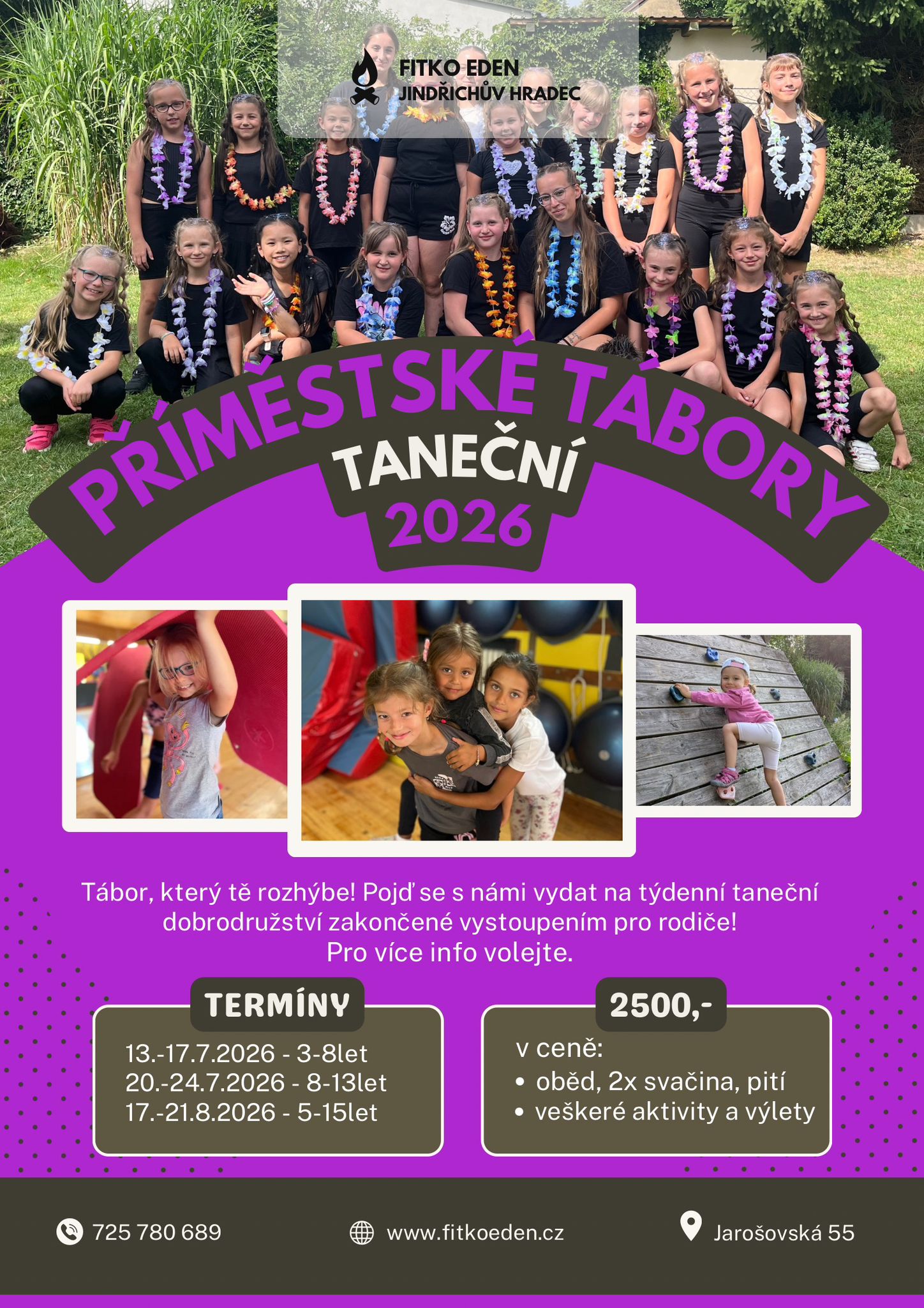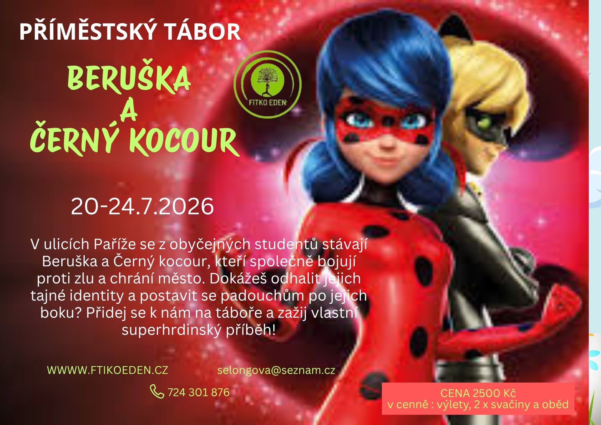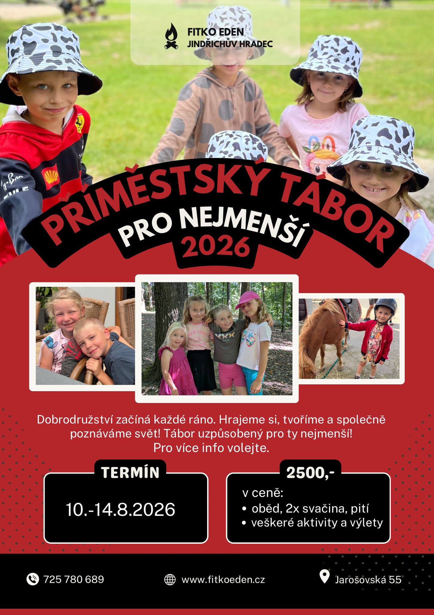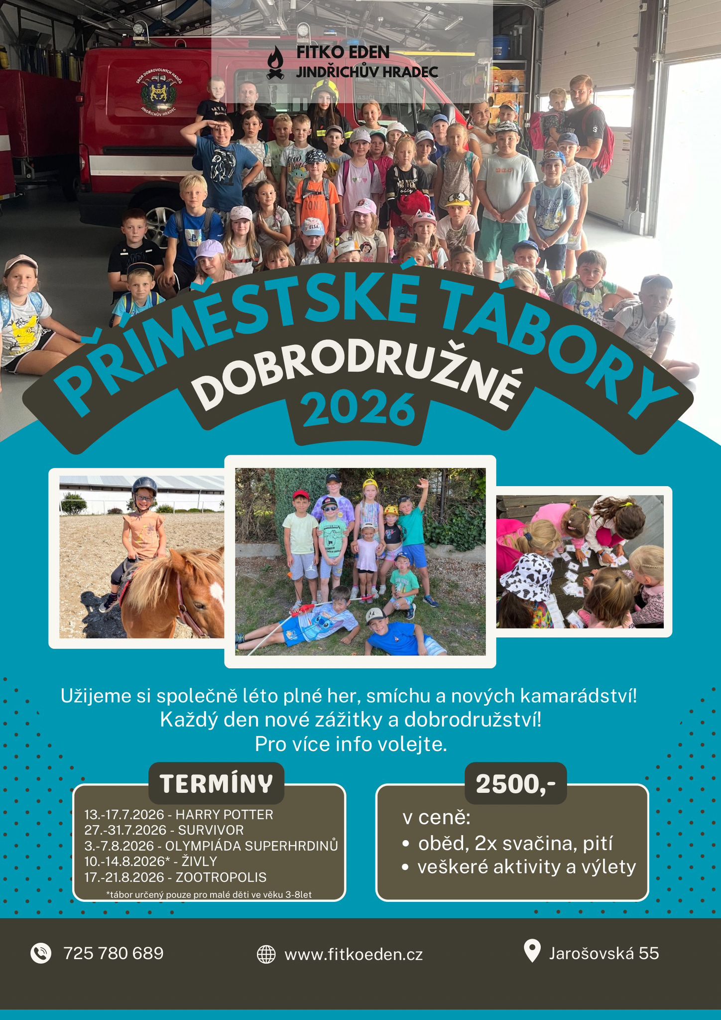Sportování, skákání na trampolíně, denní koupání v bazénu i rybníku, angličtina hrou. Sportovní i tématické hry venku i vevnitř, vodní klouzačka. Jízda na koni, dílničky, závěrečná disco párty, výlety vláčkem.
